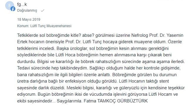 Tetkiklerde sol böbreğimde kitle? abse? görülmesi üzerine Nefrolog Prof. Dr. Yasemin Ertek hocanın önerisiyle Prof. Dr. Lütfi Tunç hocaya giderek muayene oldum. Özenle tetkiklerimi inceledi. Başka ürologlar, sol böbreğimin kesin alınması gerektiğini söylediklerinde bile Lütfi Hoca böbreğimin hemen alınmasına karşı çıkarak beni durdurdu. Bilgisi ve kararlılığı ile böbrek rahatsızlığım sürecinde aşama aşama ilerledi. Tedavi sürecinde hep takibindeydim. Sağlıkçı olduğum halde her kontrole gidişimde, bana rahatsızlığım ile ilgili bilgileri özenle anlattı. Böbreğimde görülen bu durumun üretra darlığına bağlı bir enfeksiyon olduğu görüldü. Lütfi Hocanın taktığı stent sayesinde darlık düzeldi. Mesleki bilgisi, kararlığı ve güleryüzlü için kendisine teşekkür ediyorum. Bugün böbreğimin ikisi de vücudumda işlevini görüyorsa Lütfi Hocam ve ekibi sayesindedir... Saygılarımla. Fatma TAMKOÇ GÜRBÜZTÜRK