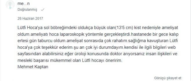 Lütfi Hoca'ya sol böbreğimdeki oldukça büyük olan(13'5 cm) kist nedeniyle ameliyat oldum.ameliyatı hoca laparoskopik yöntemle gerçekleştirdi.hastanede bir gece kalıp ertesi gün taburcu oldum.ameliyat sonrasıda çok rahatım.sağlığma kavuşturan Lütfi hoca'ya çok teşekkür ederim.şu an çok iyi durumdayım.kendisi ile ilgili bilgileri web sayfasından alabilirsiniz.eğer üroloji konusunda doktor arıyorsanız insan ilişkileri ve mesleki başarısı mükemmel olan Lütfi hocayı öneririm.